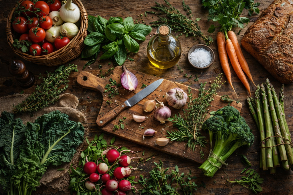 Des fruits et légumes sélectionnés avec soin, des herbes fraîches, de l’huile d’olive et l’envie de cuisiner du savoureux.